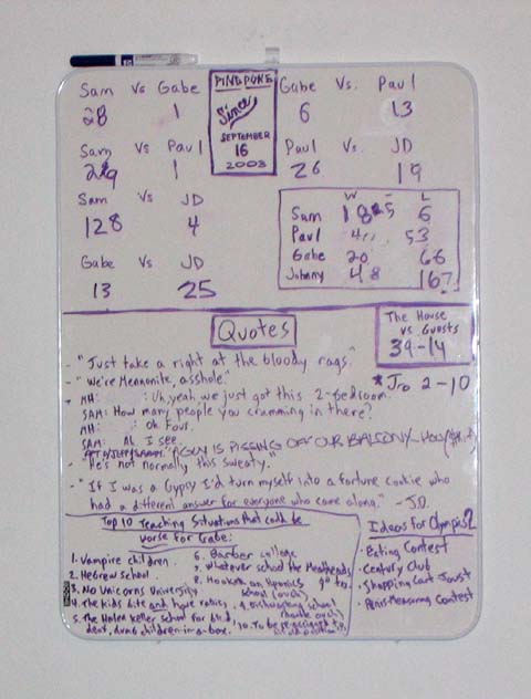 After just under 60 days, the board came down, signifying the end of summer and the end of Gabe and my teasing of alcoholism. Ralph the Wolfman ended up on top, with a sliced finger, and infected toe and a broken beer bottle he threw at a neighboor's house. 58 days, 30 steps up the wall... I hear it's only 12 steps back down. I wish they'd pay me to do this kind of math.